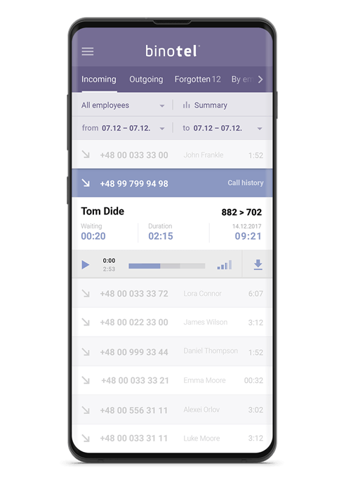 Get all statistics and audio recordings of conversations from employees' phones in MyBusiness account.