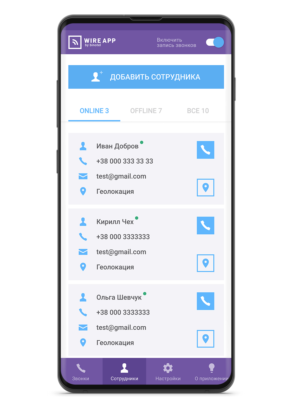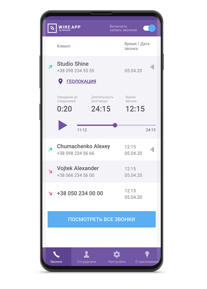 В случае плохого подключения к Интернету WIRE сохраняет историю звонков и записи на телефоне и передает данные в вашу аналитическую учетную запись MyBusiness позже, при подключении к Wi-Fi.